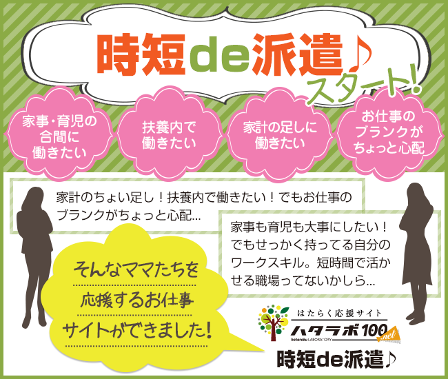 ハダラボ100.netは、そんな輝きたいママの第一歩を応援する【時短de派遣〜働くママ応援〜特集】をつくりました。